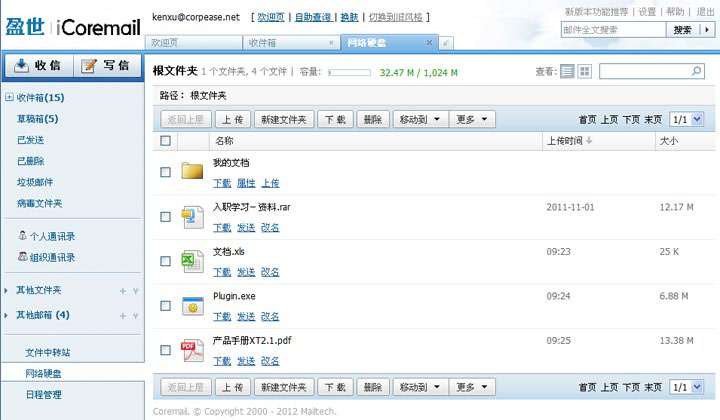 对所有邮件服务器及系统,实行24×7第三方全方位监控的企业邮箱服务商 文件中转站 不限容量的大附件发送文件中转站采用自主优化、领先的单副本技术,为用户提供大文件的网络临时存储和超大附件的投递服务。在进行超大附件投递时,收件方收到的是一个简单的下载链接,不会受对方邮箱容量的影响,解决了传统企业邮箱超大附件无法投递的难题。 邮件召回 有效减少工作失误全新Coremail企业邮箱,提供具有独家编码、解码技术的邮件召回功能,同一个站点内已发送的未读邮件可轻松撤回。减少因为错误的邮件发送而导致的工作失误。 网络硬盘 实现信息资源实时共享